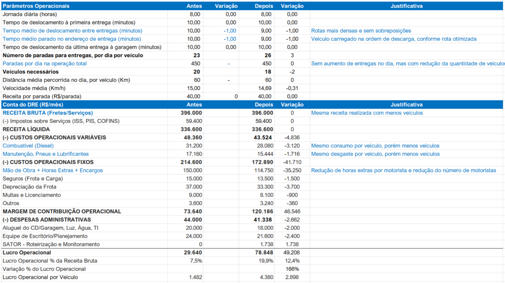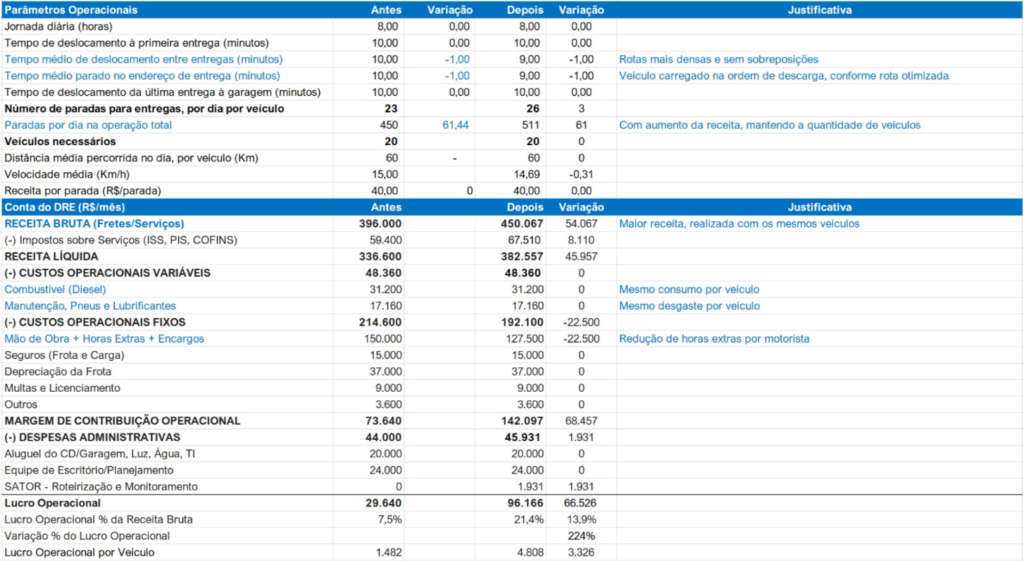 - Impacto no Faturamento: São 61 entregas extras por dia. Como os custos fixos (garagem, administrativo e depreciação) já estão cobertos pela operação base, esse faturamento adicional vai direto para o lucro operacional.